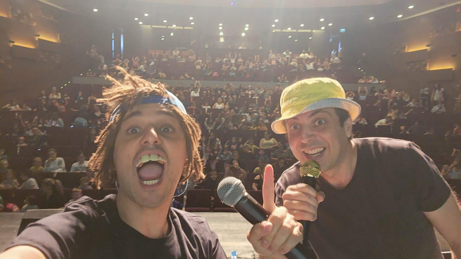 - לעופר ומאור מופע לכל המשפחה. הורים וילדים צוחקים ביחד בחוויה משותפת של צחוק.